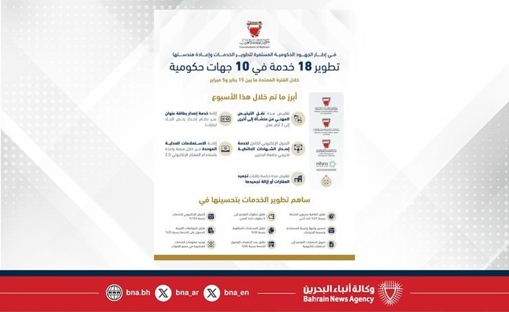 هذا الخبر يأتيكم برعاية موقع عيون الجزيرة الاخباري ويتمنى لكم قضاء وقت ممتع في قراة هذا الخبر المنامة في 5 فبراير /بنا/ في إطار الجهود الحكومية المستمرة لتطوير الخدمات وإعادة هندستها، تم خلال الفترة الممتدة ما بين 15 يناير و5 فبراير تطوير 18 خدمة في 10 جهات حكومية، وذلك في خطوة تعكس الالتزام المتواصل بتحسين جودة الخدمات الحكومية وتسريع إجراءاتها، بما يسهم في تعزيز كفاءة الأداء المؤسسي.