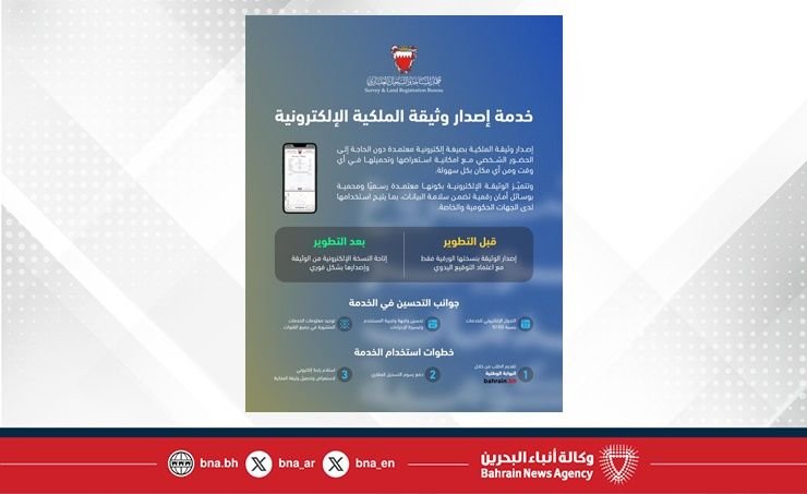 هذا الخبر يأتيكم برعاية موقع عيون الجزيرة الاخباري ويتمنى لكم قضاء وقت ممتع في قراة هذا الخبر المنامة في 09 فبراير/ بنا / في إطار الجهود الحكومية المستمرة لتطوير جودة الخدمات وإعادة هندستها، دشّن جهاز المساحة والتسجيل العقاري خدمة إصدار وثيقة الملكية الإلكترونية، كخدمة رقمية جديدة تهدف إلى تسهيل الحصول على الوثيقة، والارتقاء بتجربة المستفيدين، ودعم مسار التحول الرقمي الشامل.