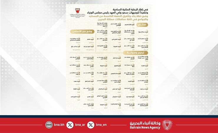 هذا الخبر يأتيكم برعاية موقع عيون الجزيرة الاخباري ويتمنى لكم قضاء وقت ممتع في قراة هذا الخبر المنامة في 16 فبراير/ بنا /في ظل الرعاية الملكية السامية من حضرة صاحب الجلالة الملك حمد بن عيسى آل خليفة ملك البلاد المعظم حفظه الله ورعاه، وتنفيذًا لأمر صاحب السمو الملكي الأمير سلمان بن حمد آل خليفة ولي العهد رئيس مجلس الوزراء حفظه الله بافتتاح وترميم وتأهيل 60 مسجدًا تابعًا لإدارتي الأوقاف السنية والجعفرية، في كافة محافظات مملكة البحرين، وذلك في إطار خطة تطوير الجوامع والمساجد، أعلن سعادة السيد نواف بن محمد المعاودة وزير العدل والشؤون الإسلامية والأوقاف أن الوزارة بدأت التنسيق مع إدارتي الأوقاف السنية والجعفرية والجهات ذات العلاقة لمباشرة تنفيذ هذه المشاريع وإنجازها.