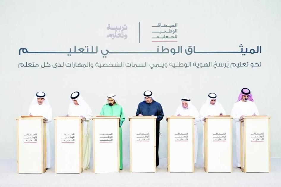 وأضاف سموّه «يمثل «الميثاق الوطني للتعليم» الذي وقّعت عليه وإخواني الحكام، في هذه المناسبة، مرجعية وطنية هدفها ترسيخ الهُوية الوطنية وبناء مهارات المستقبل وتعزيز التكامل بين الأسرة والمدرسة والمجتمع، بما يضمن استدامة العملية التعليمية واستقرارها ومرونتها ويحقق أهدافها في مخرجات نوعية تخدم تطلعاتنا وطموحاتنا ورؤيتنا للمستقبل».