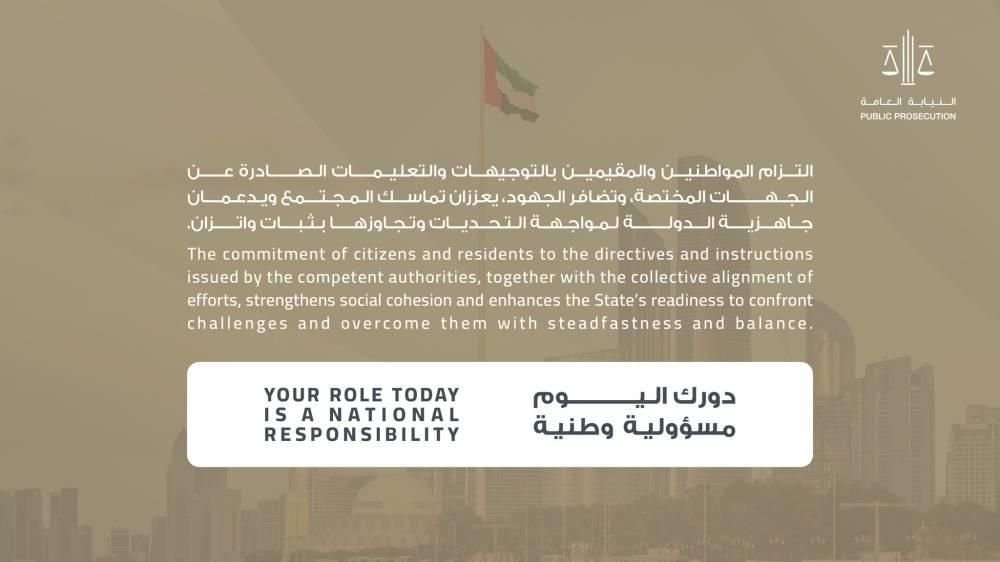 أكدت النيابة العامة للدولة، أن التزام المواطنين والمقيمين بالتوجيهات والتعليمات الصادرة عن الجهات المختصة، وتضافر الجهود الجماعية، هما الركيزتان الأساسيتان، لتعزيز تماسك المجتمع. وأوضحت أن هذا الوعي المجتمعي يدعم بشكل مباشر جاهزية الدولة، لمواجهة التحديات المختلفة وتجاوزها بثبات واتزان. وشددت على أن «دورك اليوم مسؤولية وطنية»، داعية أفراد الجمهور إلى استقاء المعلومات من المصادر الرسمية فقط، وعدم الانجراف وراء الشائعات. كما حثت الجميع على أن يكونوا إيجابيين وواعيين من خلال المشاركة في حماية المجتمع، والإبلاغ عن أي محتوى مخالف أو دعايات مثيرة عبر تطبيق «مجتمعي آمن» بكل سهولة وسرية تامة.
