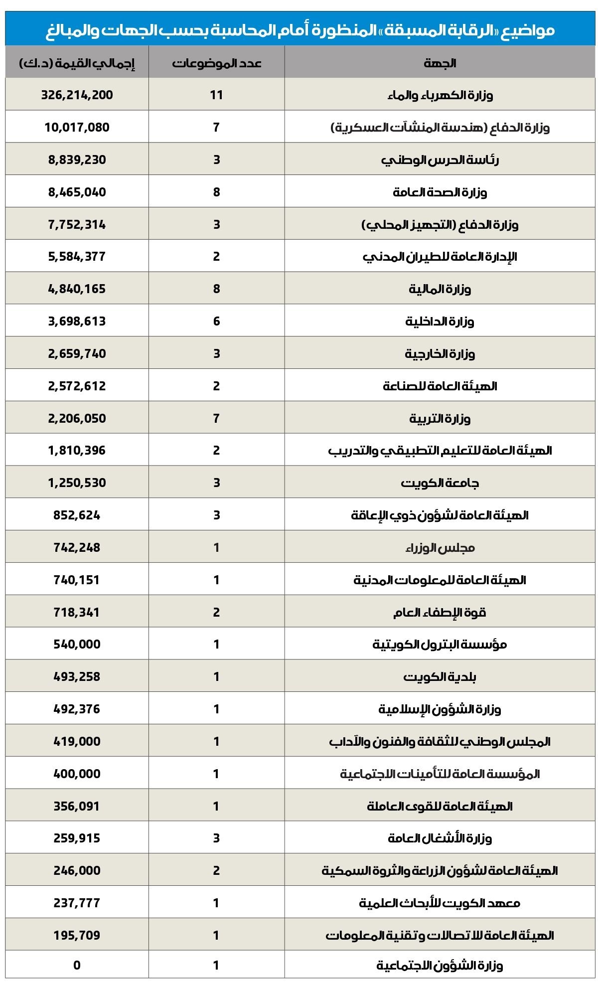 وفي بقية الترتيب، جاءت الإدارة العامة للطيران المدني بموضوعين بقيمة 5.58 ملايين دينار، ثم وزارة المالية بـ8 موضوعات بقيمة 4.8 ملايين، تلتها وزارة الداخلية بـ6 موضوعات بقيمة 3.7 ملايين، وجاءت وزارة الخارجية بـ3 موضوعات بقيمة 2.65 مليون، ثم الهيئة العامة للصناعة بموضوعين بقيمة 2.57 مليون.