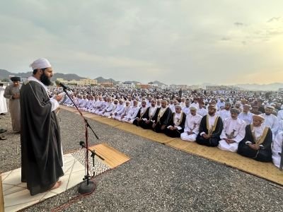 وقد أمّ المصلين فيصل بن علي العدوي، حيث تناول في خطبته عدة مضامين إيمانية ووطنية، مستلهماً فضائل الشهر الفضيل ومعاني العيد السامية، حيث رفع في مستهل خطبته التهاني والتبريكات للمصلين بهذه المناسبة المباركة، سائلاً الله أن يعيدها على الجميع بالخير واليمن والبركات، كما حث المصلين على دوام العمل الصالح بعد رمضان، مؤكداً أن أفضل الأعمال أدومها وإن قلّت، وأن المساجد تبقى مفتوحة والقرآن يُتلى، ودعا إلى التمسك باللحمة الوطنية وإصلاح ذات البين، مؤكداً أن صفاء القلوب ونقاء السرائر أساس لاستقرار المجتمع.