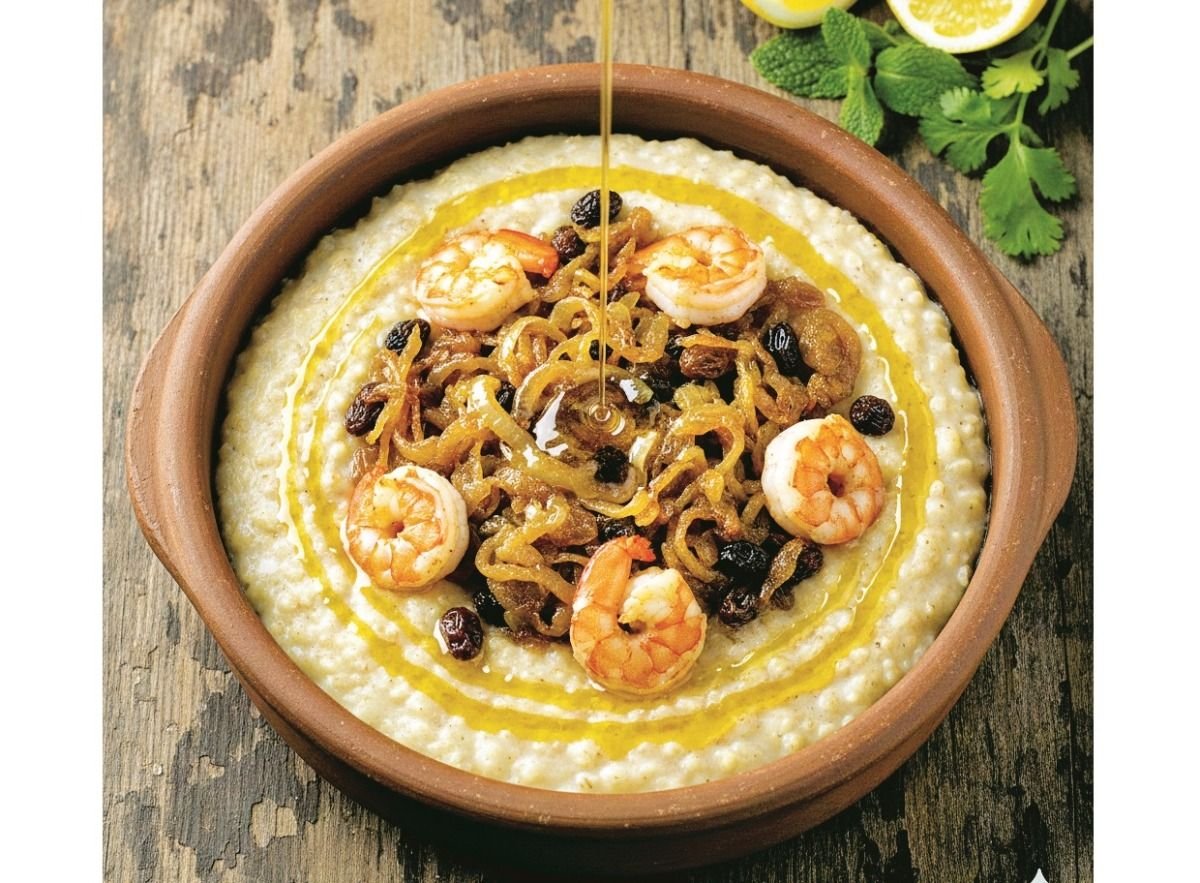 نستخدم ملعقة خشبية كبيرة لضرب الجريش مع الروبيان حتى يتجانس الروبيان مع القمح ويصبح القوام كريمياً وثقيلاً.