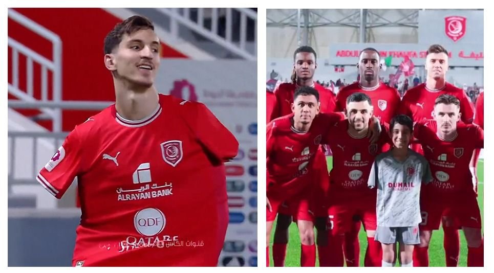 وفي الدقيقة 13 من المباراة، أحرز عادل بولبينة للدحيل، واحتفل بوضع يديه داخل قميصه "كأنه مبتور الذراعين"، دعما لهذا الطفل.