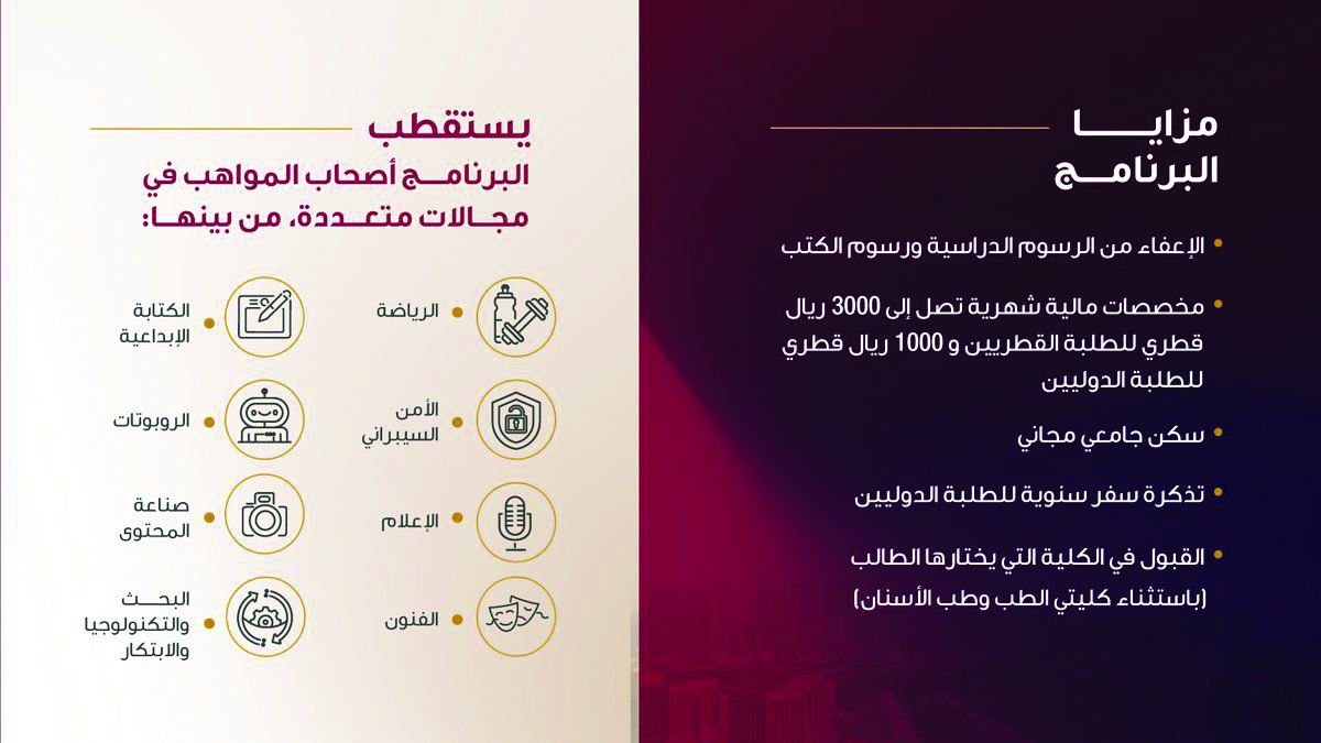 ويساهم البرنامج في توفير بيئة أكاديمية للطلاب الذين يمتلكون مواهب في مجالات متنوعة، ومن ابرز مزايا البرنامج الإعفاء من الرسوم الدراسية ورسوم الكتب ومخصصات مالية شهرية تصل إلى 3000 ريال قطري للطلبة القطريين و1000 ريال قطري للطلبة الدوليين وسكن جامعي مجاني وتذكرة سفر سنوية للطلبة الدوليين والقبول في الكلية التي يختارها الطالب باستثناء كليتي الطب وطب الأسنان.
