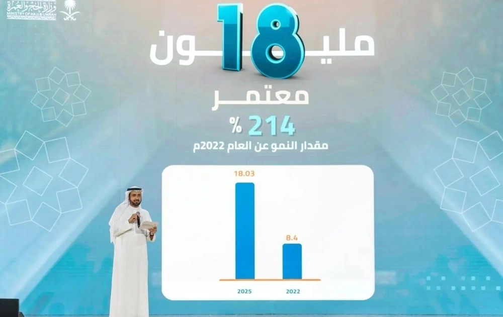وبيَّن أن عدد المعتمرين القادمين من خارج المملكة هذا العام بلغ 18 مليون معتمر، بنسبة نموَّ تجاوزت 214% مقارنة بعامي 2022 و2025، منوهًا بالدعم والتمكين الذي توليه قيادة المملكة وعنايتها القصوى لقطاع العمرة والزيارة، وللجهود التي تستهدف رعاية ضيوف الرحمن وخدمة قاصدي الحرمين الشريفين.