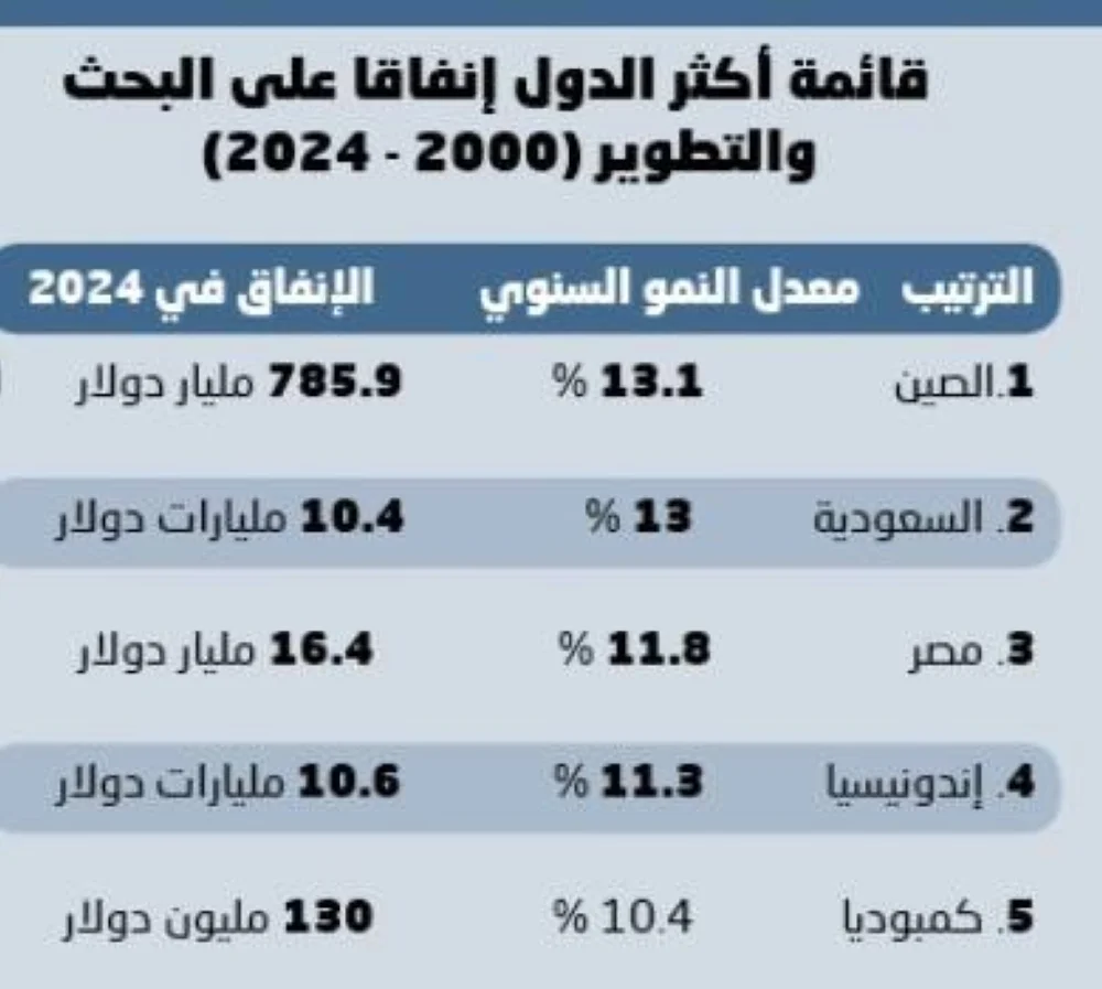 ونشر الموقع تصنيفا لأسرع الدول نموًا في الإنفاق على البحث والتطوير عالميًا، استنادًا إلى معدل النمو السنوي المركب لإجمالي الإنفاق على البحث والتطوير بين عامي 2000 و2024، باستخدام بيانات من المنظمة العالمية للملكية الفكرية (الويبو).