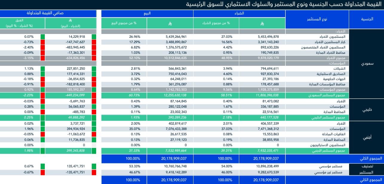 وتأثرت تعاملات السعوديين؛ بأداء المستثمرين الأفراد الذين سجلوا صافي بيع بواقع 634.83 مليون ريال؛ نتيجة فارق مشتريات بلغت 9.87 مليار ريال مقابل مبيعات بقيمة 10.51 مليار ريال.