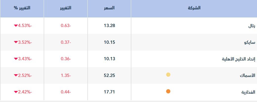 وهيمن التراجع على أداء 183سهما، تصدرها سهم "رتال" بتراجع نسبته 4.5%، تلاه سهم " سايكو" بنسبة تراجع بلغت 3.52%.