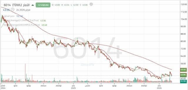 ومع بداية عام 2026 بدأ السهم في الارتداد لاختبار المقاومة الرئيسية عند 46.60 ريال ولكن لم تكن القوة الشرائية كافية لاختراق المستوى وعاود السهم اختبار مستوى دعم هام بالقرب من 41.50 ريال والتي تتوافق مع وجود فجوة سعرية مما يشر إلى أهمية المستوى الفني، حيث نجاح السعر في التداول أعلى المستوى مع ارتفاع أحجام التداول من شأنه أن يمهد الطريق للارتداد نحو 43.80 ريال - 44.90 ريال، تجاوز المستوى يدفع السعر نحو 46.60 ريال، حيث يمثل مقاومة فنية على الرسم البياني وحاجزاً نفسياً للمتعاملين في الوقت نفسه.