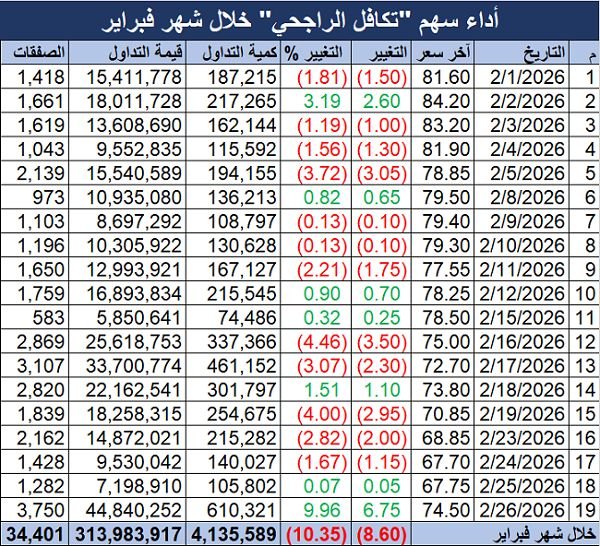 مباشر ـ ثابت شحاتة: سجل سهم شركة الراجحي للتأمين التعاوني "تكافل الراجحي"، ارتفاعا ملحوظاً خلال جلسة اليوم الخميس؛ مسجلا أعلى مكاسب 25 جلسة، وذلك تزامنا مع إعلان الشركة عن نتائجها المالية لعام 2025.