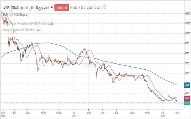 مباشر للأبحاث: يستمر سهم شركة الشرق الأوسط للرعاية الصحية (السعودي الألماني الصحية)، في التحرك ضمن اتجاه هابط حاد مدفوعاً بضغوط بيعية مكثفة، حيث تستقر التداولات دون المتوسط المتحرك قصير المدى (50 يوماً) والمتوسط المتحرك طويل المدى (200 يوم)؛ مما يعكس سيطرة الضغوط البيعية واستمرار الاتجاه الهابط، مع غياب مؤشرات واضحة على تحول إيجابي في الوقت الراهن.