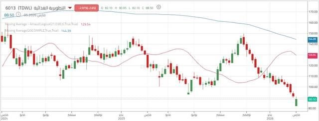 مباشر للأبحاث: يواصل سهم التطويرية الغذائية تحركاته السلبية على الإطار الأسبوعي، في ظل سيطرة واضحة للضغوط البيعية، بعد أن أغلق دون مستوى الدعم الرئيسي عند 91.80 ريال؛ ما يعكس استمرار الاتجاه الهابط وتصحيحاً عميقاً للموجة الصاعدة السابقة.