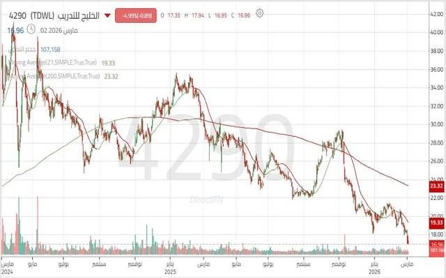 مباشر للأبحاث: يتحرك سهم شركة الخليج للتدريب والتعليم "الخليج للتدريب" ضمن اتجاه هابط ثانوي يعكس ضغوطاً واضحة على الأداء السعري خلال الفترة الأخيرة، وتظهر الحركة استمرار تسجيل مستويات أقل؛ مما يؤكد سيطرة القوة البيعية.