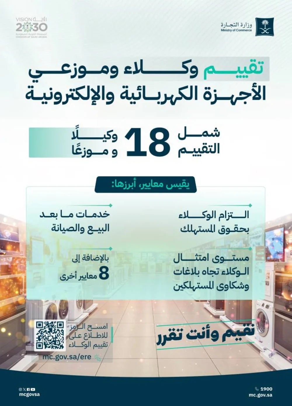 شمل تقييم وكلاء وموزعي الأجهزة الكهربائية والإلكترونية (18 وكيلًا وموزعًا)، واشتمل على 11 معيارًا، أبرزها: الالتزام بحقوق المستهلك، وخدمات ما بعد البيع والصيانة، ومستوى الامتثال لبلاغات وشكاوى المستهلكين، وذلك لمساعدة المستهلك على اتخاذ قرارات شراء واعية، وتعزيز التنافسية بين الوكلاء.