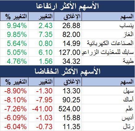 وعلى صعيد أداء الأسهم، شملت المكاسب 95 سهما بصدارة سهم "ينساب"، الذي صعد 9.94%، وكان المركز الثاني لسهم "الغاز" بارتفاع نسبته 9.85%.