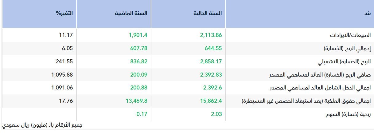 وعلى صعيد الإيرادات، ارتفعت المبيعات بنسبة 11.17% لتصل إلى 2.11 مليار ريال، مقابل 1.90 مليار ريال في عام 2024.