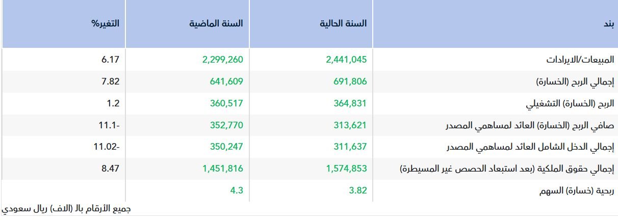 وفي المقابل، ارتفعت إيرادات الشركة بنسبة 6.17% لتصل إلى نحو 2.44 مليار ريال في عام 2025، مقارنة 2.30 مليار ريال في العام السابق.