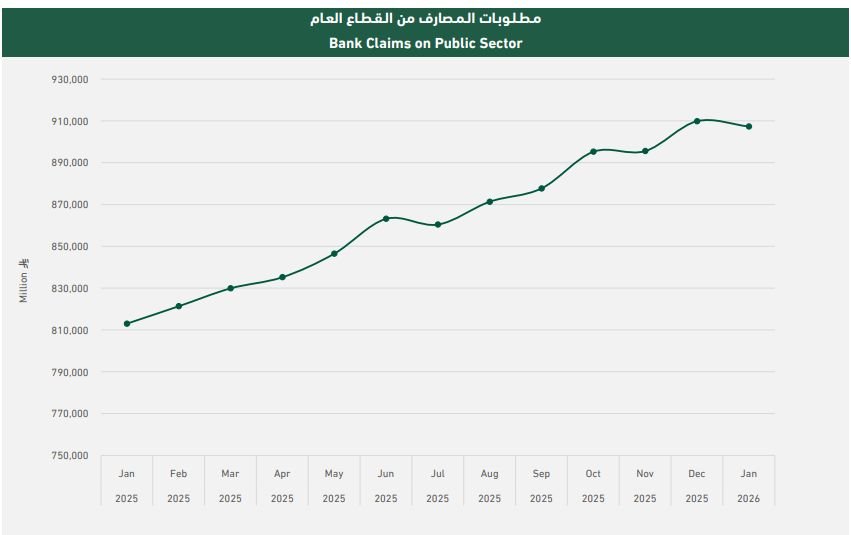 وبلغت مطلوبات البنوك الإجمالية من القطاع العام 907.34 مليار ريال بنهاية شهر يناير/ كانون الثاني الماضي؛ مقابل 813.02 مليار ريال في نهاية الشهر المماثل من عام 2025م؛ لتزيد بنسبة 11.6%، وبما يعادل 94.32 مليار ريال، فيما كانت تبلغ 909.86 مليار ريال بنهاية ديسمبر/ كانون الأول الماضي.