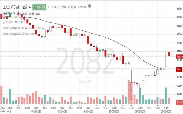 وتجاوز السهم مقاومة 171.5 ريال، مما قد يؤدي إلى امتداد الحركة الصاعدة نحو 176.80 ريال – 179.40 ريال، وفي حال معاودة السعر للتصحيح نحو الفجوة الصاعدة الناتجة عن صعود جلسة اليوم يظل الحفاظ على مستوى الدعم عند 165.00 ريال أمرًا أساسيًا لتعزيز النظرة الإيجابية وفرص استمرار الصعود في ظل الضغط البيعي.