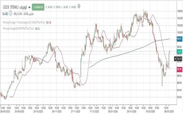 وفي جلسة اليوم الأحد، سجل السهم ارتفاعاً ملحوظاً مخترقاً مستوى مقاومة رئيسي بالقرب من 94.10 ريال. ويشكل الثبات أعلى هذا المستوى إشارة إيجابية تعزز فرص استهداف مستويات 96.50 – 97.45 ريال، فيما قد يمهد اختراق هذه المستويات الطريق نحو مكاسب إضافية عند 99.35 ريال.