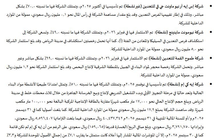 وكشفت الشركة، أنه تم شطب 5 شركات من بين الشركات التسعة، والتي تم تأسيسها و / أو الاستثمار فيها لغرض الحصول على تراخيص أراضي ومحاجر إضافية؛ وذلك نتيجة عدم نجاح العروق المقدمة، وذلك دون أي أثر مالي سلبي، فيما تشمل الشركات التابعة الأربعة المتبقية شركة غير نشطة و3 شركات نشطة.