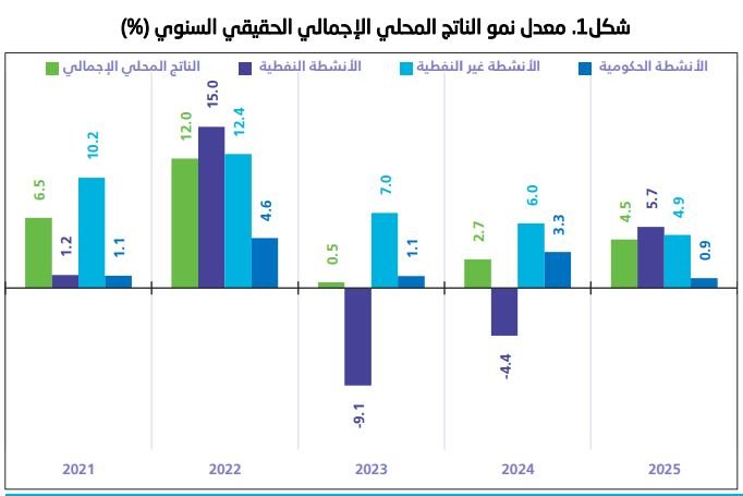 وكانت الأنشطة غير النفطية المساهم الرئيسي في نمو الناتج المحلي الإجمالي الحقيقي لعام 2025م؛ حيث ساهمت بمقدار 2.8%، كما ساهمت الأنشطة النفطية بمقدار 1.4%، وساهمت كل من الأنشطة الحكومية وصافي الضرائب على المنتجات إيجابياً بمقدار 0.1% و0.2% على التوالي.