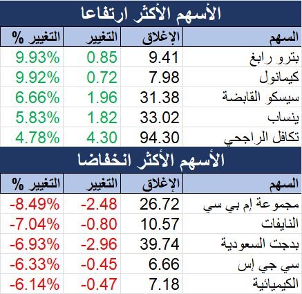وجاء إغلاق 42 سهما إيجابيا، تصدرها سهم "بترو رابغ" الذي أغلق مرتفعا 9.93%، واحتل سهم "كيمانول" المركز الثاني بقائمة الارتفاعات بعد صعوده 9.92%.