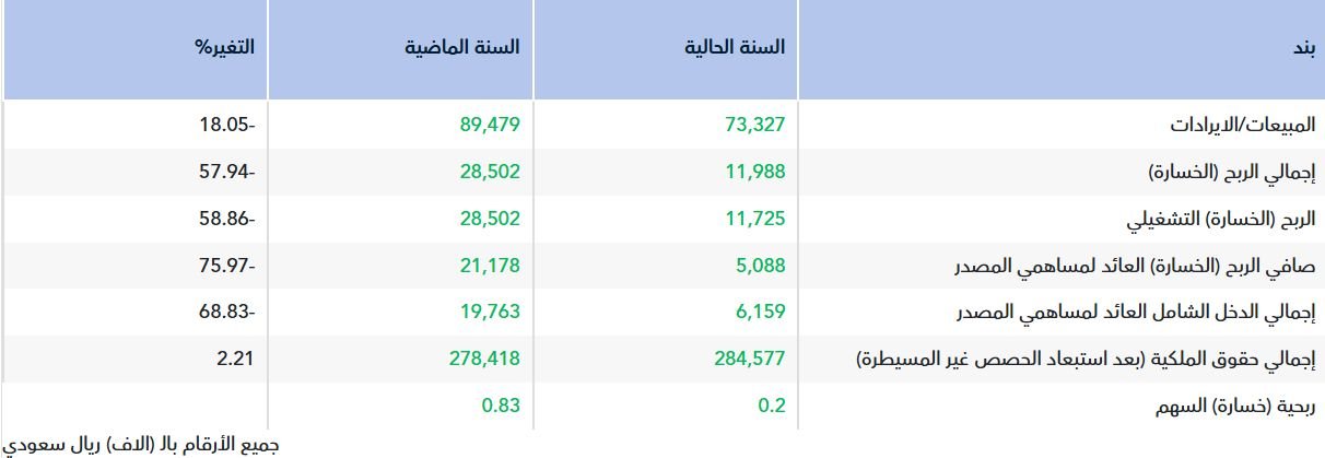 وقالت الشركة إن الانخفاض في صافي الربح يعود إلى انخفاض الإيرادات بنسبة 18%، كما انخفض صافي الدخل التشغيلي بنسبة 59% من 28.50 مليون ريال سعودي في ديسمبر عام 2024 إلى 11.73 مليون ريال سعودي في ديسمبر عام 2025 وذلك نتيجة انخفاض الإيرادات بنسبة 18% .