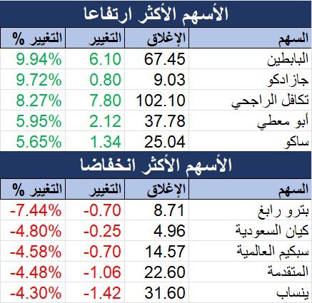 وعلى صعيد أداء الأسهم، شملت المكاسب 180 سهما بصدارة سهم "البابطين"، الذي صعد 9.94%، تلاه سهم "جازادكو" بارتفاع نسبته 9.72%.