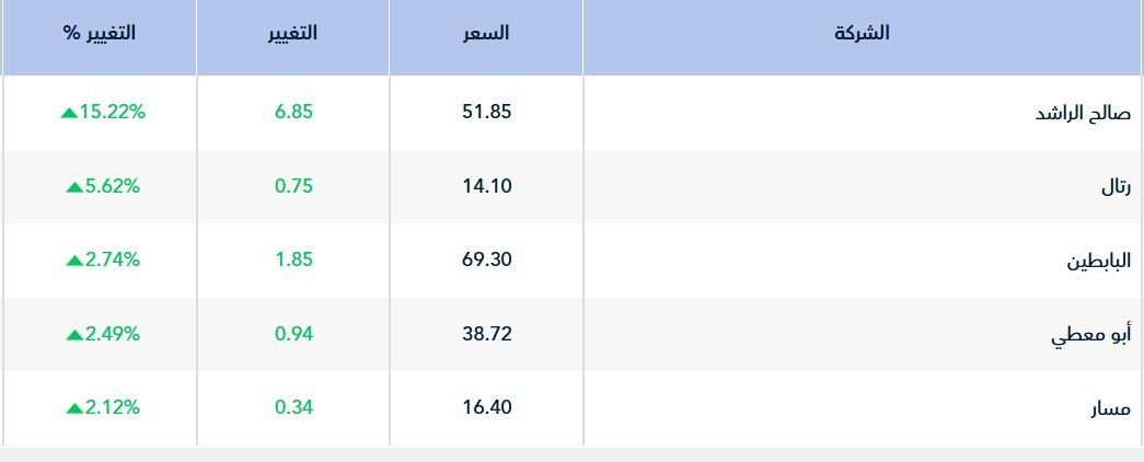 وسجل أداء 98سهماً ارتفاعاً، تصدرها سهم "صالح الراشد" بارتفاع 15.22%، تلاه سهم "رتال" بنسبة 5.62.%