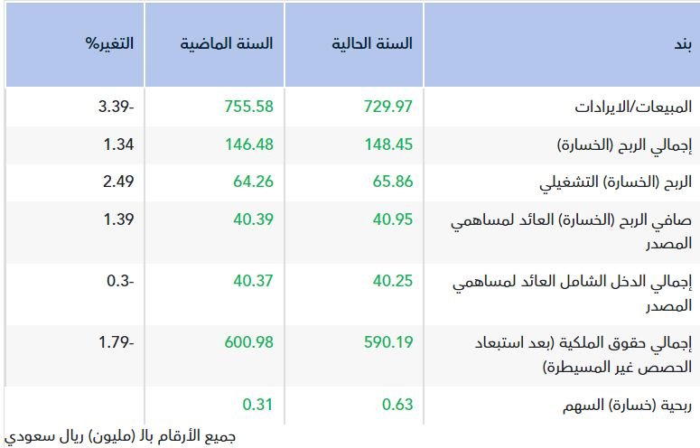 وقالت الشركة، إن تراجع تكاليف التمويل، وانخفاض المصروفات العمومية والإدارية، وانخفاض مصروف الزكاة والضريبة، قد أسهم في تحقيق زيادة في صافي الربح مقارنة بالعام السابق، وذلك على الرغم من انخفاض المبيعات.