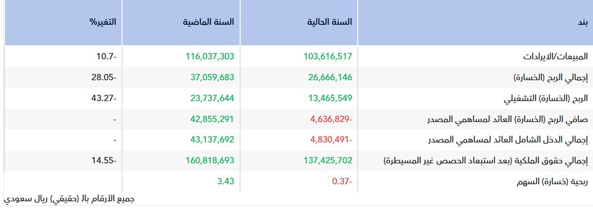 كما سجلت الشركة خسارة للسهم بلغت 0.37 ريال في عام 2025، مقابل ربحية للسهم بلغت 3.43 ريال خلال العام السابق.