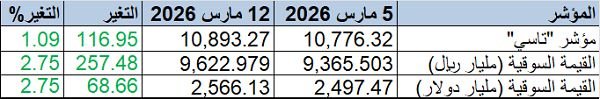 وسجل المؤشر العام للسوق "تاسي" ارتفاعاً نسبته 1.09%، بمكاسب بلغت 116.95 نقطة، صعد بها إلى مستوى 10,893.27 نقطة، مقابل 10,776.32 نقطة بالأسبوع الماضي.