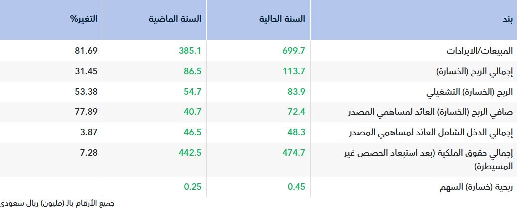 وارتفعت الإيرادات بنسبة 81.7%، لتصل إلى 699.7 مليون ريال، مقابل 385.1 مليون ريال في عام 2024.