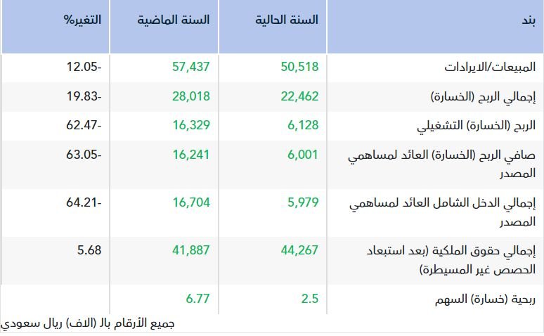 ووفقا لبيانات الشركة المالية، الصادرة على "تداول" اليوم الأحد، بلغ صافي الربح العائد للمساهمين 6 مليون ريال، مقابل 16.24 مليون ريال في عام 2024م.