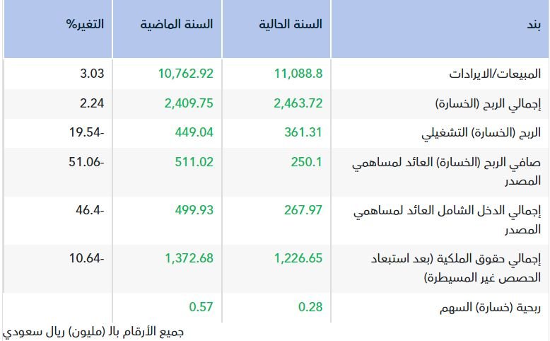 ووفقا لبيانات الشركة المالية، الصادرة على "تداول" اليوم الأحد، بلغ صافي الربح العائد للمساهمين 250.1 مليون ريال، مقابل 511.02 مليون ريال في العام 2024م.