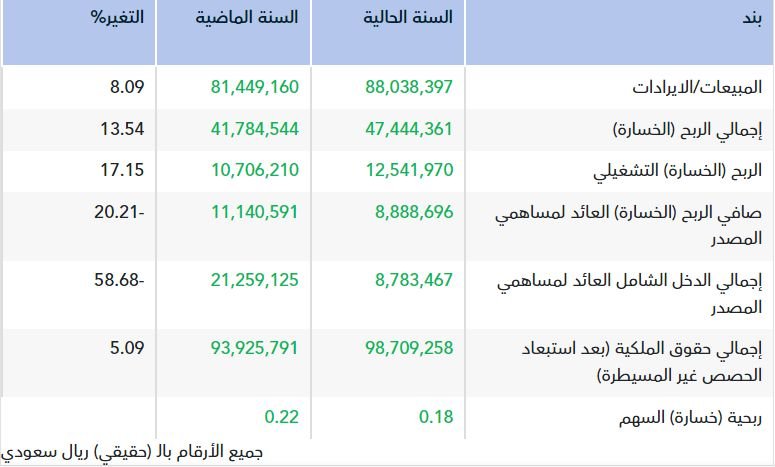 ووفقا لبيانات الشركة المالية، الصادرة على "تداول" اليوم الأحد، بلغ صافي الربح العائد للمساهمين 8.89 مليون ريال، مقابل 11.14 مليون ريال في عام 2024م.