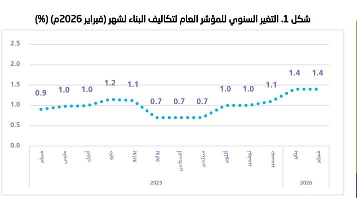 الرياض – مباشر: سجل الرقم القياسي لتكاليف البناء بالمملكة العربية السعودية ارتفاعا نسبته 1.4% خلال شهر فبراير/ شباط 2026م على أساس سنوي.