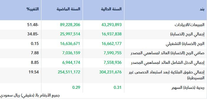 وأظهرت نتائج الشركة تراجع إجمالي المبيعات/الايرادات بنسبة 51.48%، إلى 43.29 مليون ريال مقابل 89.23 مليون ريال في عام 2024، وذلك نتيجة انخفاض مبيعات الأراضي والعقارات، وتراجع إيرادات الإيجارات.