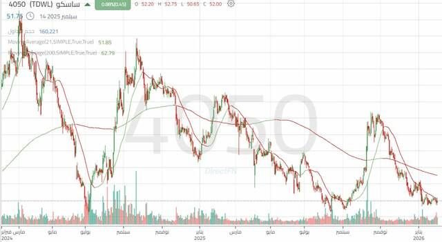 مباشر للأبحاث: يتحرك سهم ساسكو داخل اتجاه هابط رئيسي، ويتحرك السعر حالياً داخل نطاق عرضي في نموذج مثلث متماثل؛ للعودة إلى الإيجابية يجب الثبات أعلى مستوى 53.50 ريال بأحجام تداول مرتفعة لاستهداف 54.65 ريال، ثم مستوى 55.35 ريال.