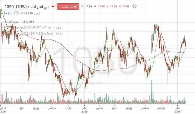 منذ مطلع عام 2025، شهد سهم بي اس اف ارتفاع ملحوظ خلال الربع الأول من العام، حيث ارتفع السعر من مستوى 14.60 ريال وارتفع إلى مستوى 17.85 ريال، ثم تعرض السهم لضغوط بيعية حادة في بداية شهر أبريل، ودخل السهم في نطاق عرضي حتى شهر فبراير من عام 2026.
