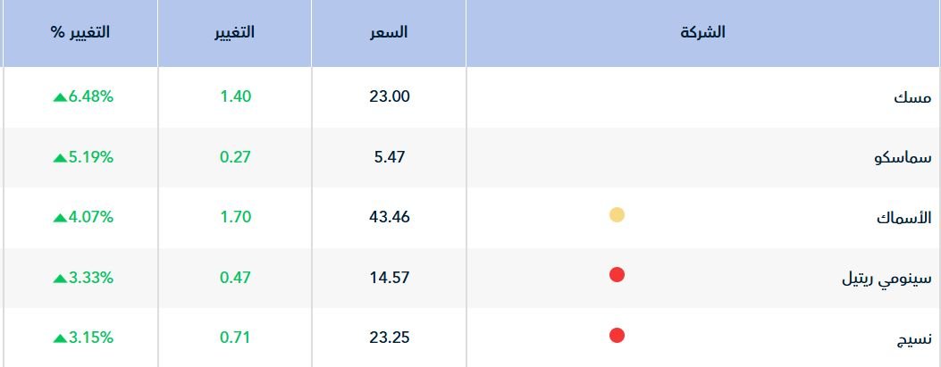 وسجل أداء 232 سهمًا ارتفاعاً، تصدرها سهم " مسك" بارتفاع 6.48%، تلاه سهم "سماسكو" بنسبة 5.19%.