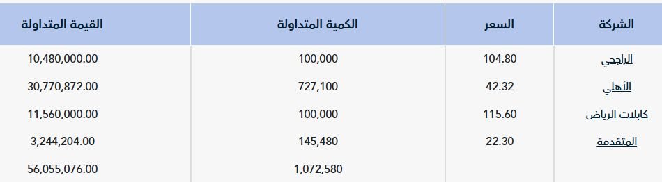 وتم تنفيذ صفقة خاصة على سهم "كابلات الرياض " بقيمة 11.56 مليون ريال، من خلال 100 ألف سهم عند سعر 115.6 ريال، كما تم تنفيذ صفقة خاصة على سهم "المتقدمة" بقيمة 3.24 مليون ريال، من خلال 145.48 ألف سهم بسعر 22.3 ريال.