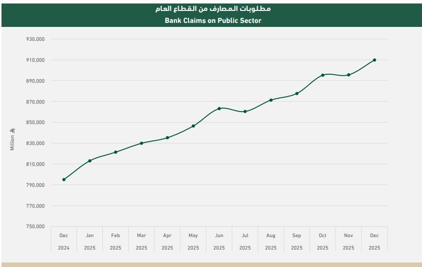 وتضمنت مطلوبات البنوك من القطاع العام أيضاً ائتماناً مصرفياً للمؤسسات العامة (يشمل قروضاً وسلفاً وسحوبات على المكشوف) بقيمة 256.6 مليار ريال بنهاية ديسمبر/ كانون الأول 2025م، مقابل 203.1 مليار ريال بنهاية الشهر ذاته من العام السابق؛ لترتفع بنحو 26.3% وبما يعادل 53.5 مليار ريال.