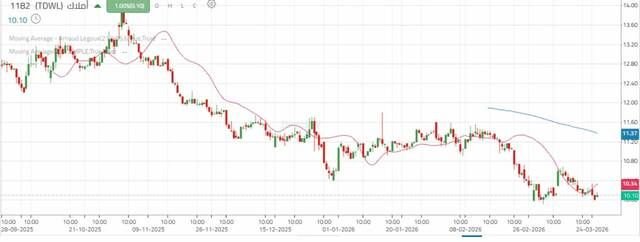 يتحرك سهم أملاك ضمن اتجاه هابط ثانوي يعكس ضغوطًا واضحة على الأداء السعري خلال الفترة الأخيرة. وتظهر الحركة استمرار تسجيل مستويات أقل، ما يؤكد سيطرة القوة البيعية، وافتتح السهم جلسة اليوم على هبوط ملحوظ ويقترب السعر من مستوى دعم هام بناءً على نسب فيبوناتشي التصحيحية عند 10.50 ريال، يجب الحفاظ على الدعم لتجنب المزيد من التراجعات نحو 10.20 – 10.15 ريال، وستظل النظرة السلبية قائمة طالما يتداول السعر دون المقاومة الرئيسية حول 11.65 ريال.