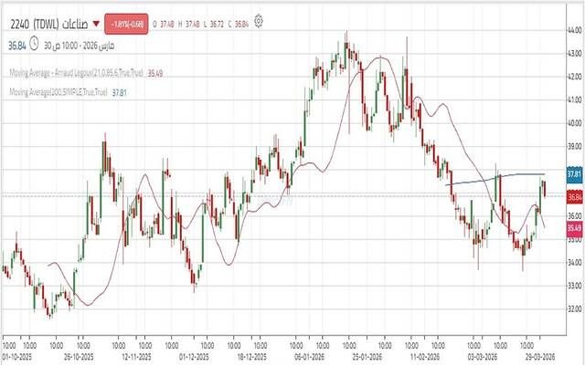 وفي حال اختراق هذه المستويات ستكون إشارة على سيطرة القوة الشرائية بما يدعم استهداف مستويات أعلى بالقرب من 40.10 – 40.95 ريال، ويمثل التماسك أعلى مستوى 36.80 ريال عاملاً هاماً للحفاظ على النظرة الإيجابية على المدى القصير.