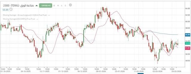 افي المقابل، يظل الحفاظ على مستوى 52.55 ريال ضرورياً لدعم فرص التماسك، حيث إن كسره قد يعيد الضغوط البيعية ويدفع السعر للتراجع نحو 51.20 – 50.30 ريال.