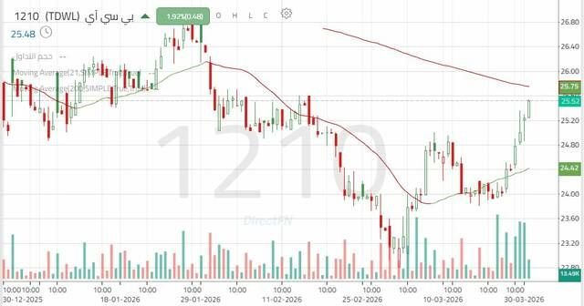 بدأ سهم بي سي آي تداولاته خلال عام 2025 عند مستوى مرتفع نسبياً مع أحجام تداول ضعيفة في شهر يناير، وبداية من شهر فبراير، أظهر ضعف واضح في السلوك السعري، حيث تعرض السهم لضغوط بيعية حتى شهر أبريل، ونجح السعر في الصعود حتى شهر أكتوبر في إطار حركة تصحيحية قصيرة المدى، ثم استكمل السعر الاتجاه الهابط حتى شهر مارس عام 2026. وبدأ السهم في تكوين إشارات إيجابية على السلوك السعري مع محاولة اختراق مقاومة هام حول 25.00.